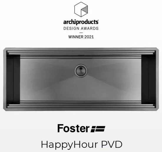 本次获得2021 年 Archiproducts 设计大奖的主角是Foster全新系列的 HappyHour(1236 x 503mm),令人耳目一新的创新点在于采用三种 Foster专属 PVD定制表面处理,分别是:枪黑色、古铜色、金色。Foster HappyHour 这款产品赢得评审团的一致青睐,其功能性理念广受好评。评审团认为该款核心产品由于其种类繁多的配件将水槽的定义推向了新的视野,它得以成为派对、自助餐的真正主角,同时也可以成为一个兼顾实用性与完备功能性的厨师台。该款产品可以在操作台上将多功能配件洗涤区域隐形,兼为派对活动提供空间。
