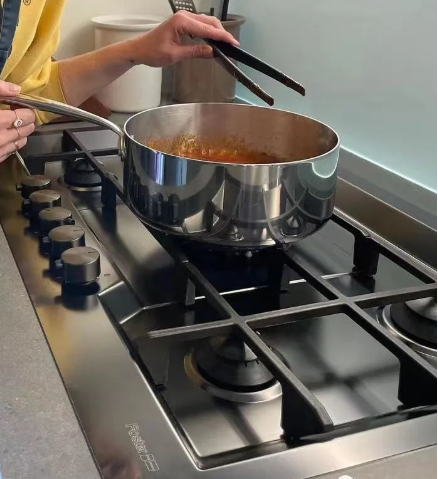 准备酱汁也是意大利面非常关键的一环。主妇根据意大利面的形状来调整酱的质地,将锅里煮面的水放在一旁备用,在稀释酱汁时将会用到。在锅中放入黄油,小火融化,主妇在平底锅里放入肉丁,小火炒至变色,再放入洋葱,炒至变软。放入西红柿,开中火,翻炒至出来汤汁,然后加入番茄酱翻炒均匀。